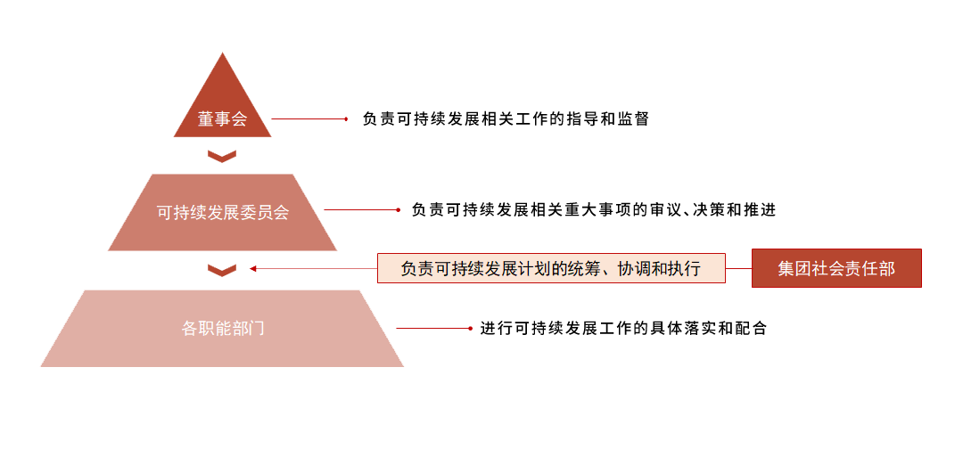 我们相信,科学高效的治理架构是推动企业可持续发展建设的基石。2021 年泛亚电竞成立了独立的企业社会责任(简称“CSR”)部门,为进一步推动企业的可持续发展,2022 年 1 月 17 日泛亚电竞成立了企业社会责任委员会,并在2023年初升级为可持续发展委员会。委员会将作为上市公司的战略决策机构, 由泛亚电竞董事长王佶担任名誉主席、总裁谢斐担任主席,各职能高层为主要成员,从组织架构上保障了今后可持续发展事务运作的有效推进。